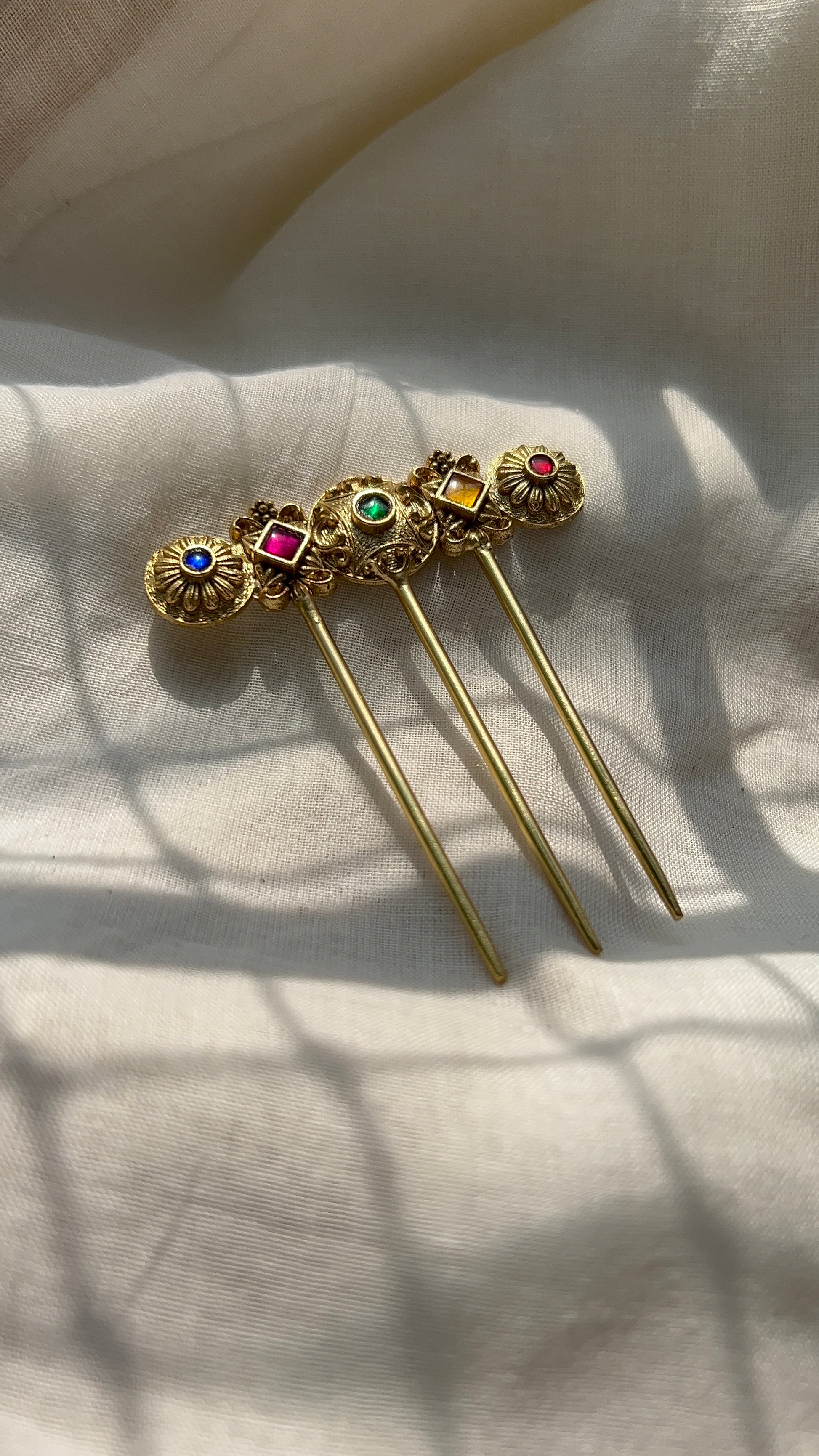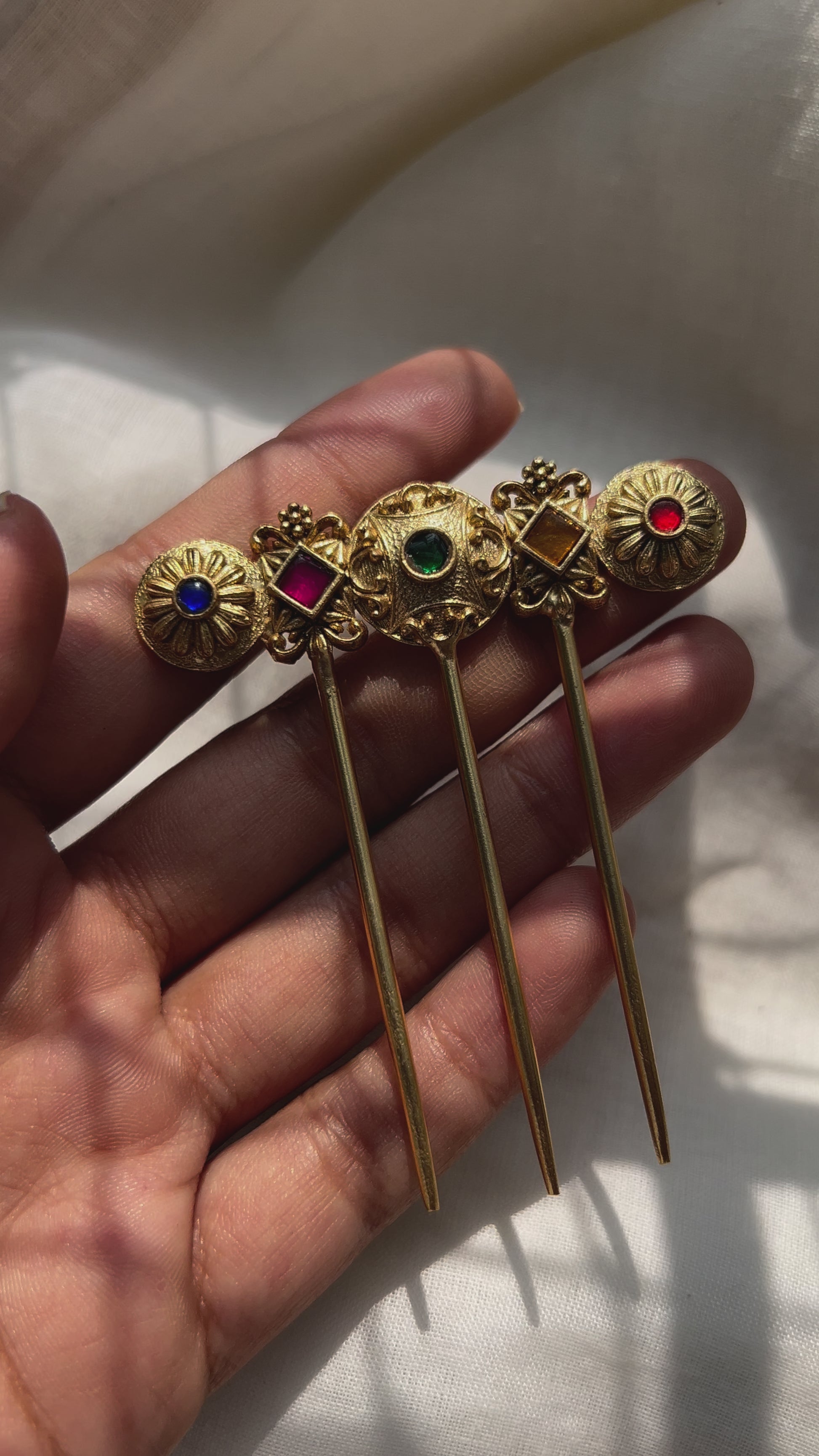 The Aadya Brooch is a delicate accessory, showcasing an intricate design adorned with five tiny panchratan stones, each gleaming with subtle brilliance. Its refined craftsmanship adds a touch of sophistication to any attire, making it a charming and versatile piece. Elevate your style with this understated yet elegant Aadya stick.