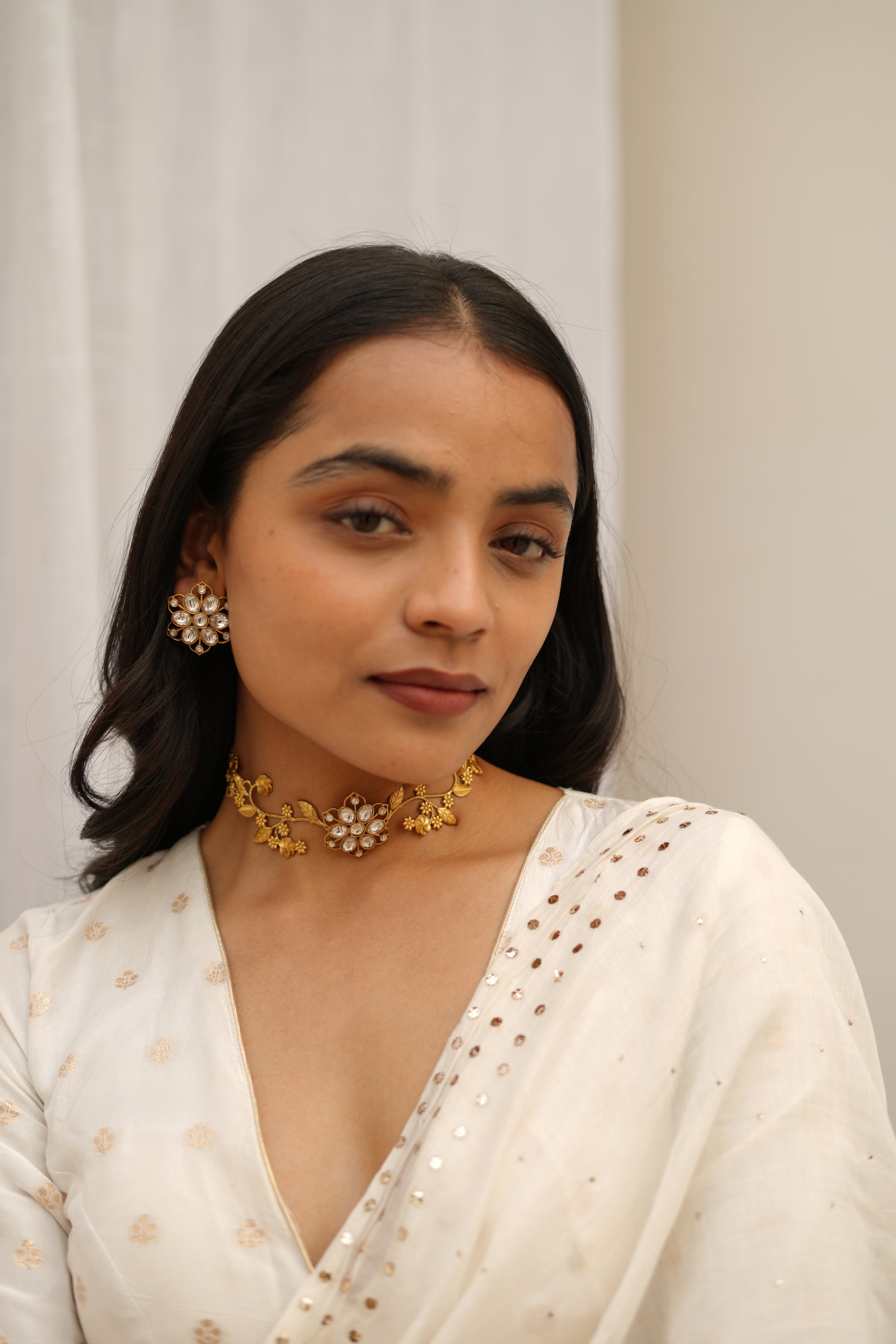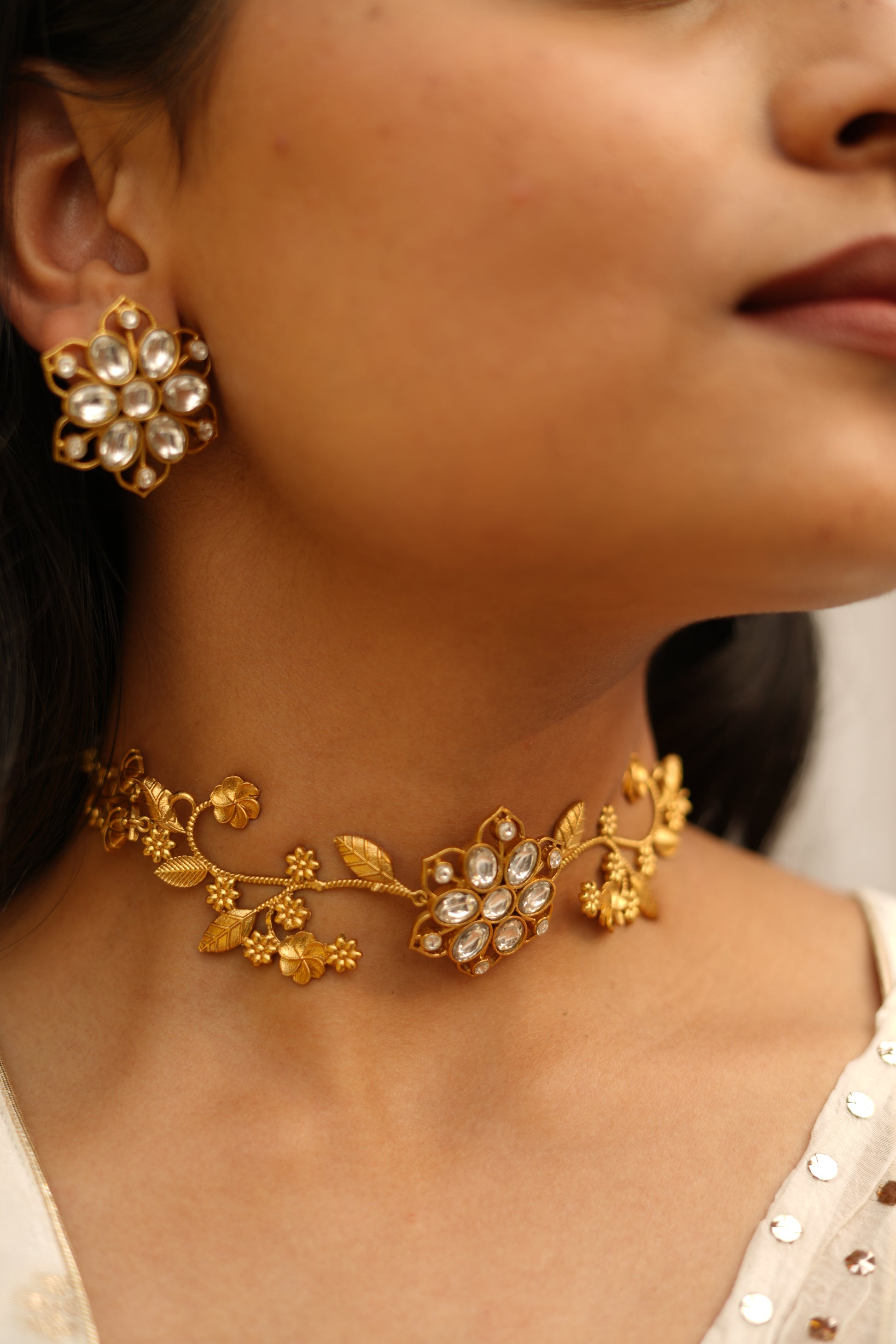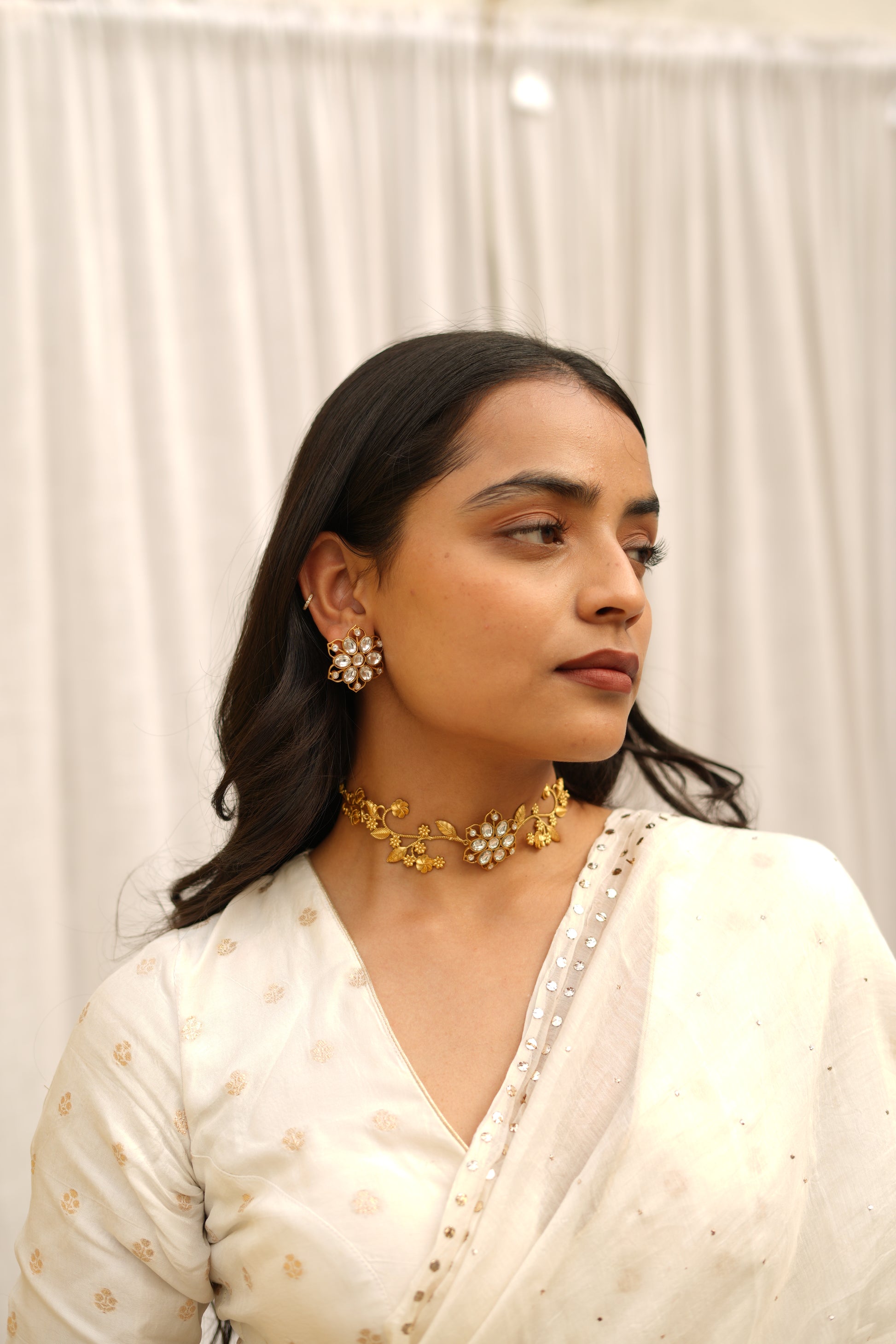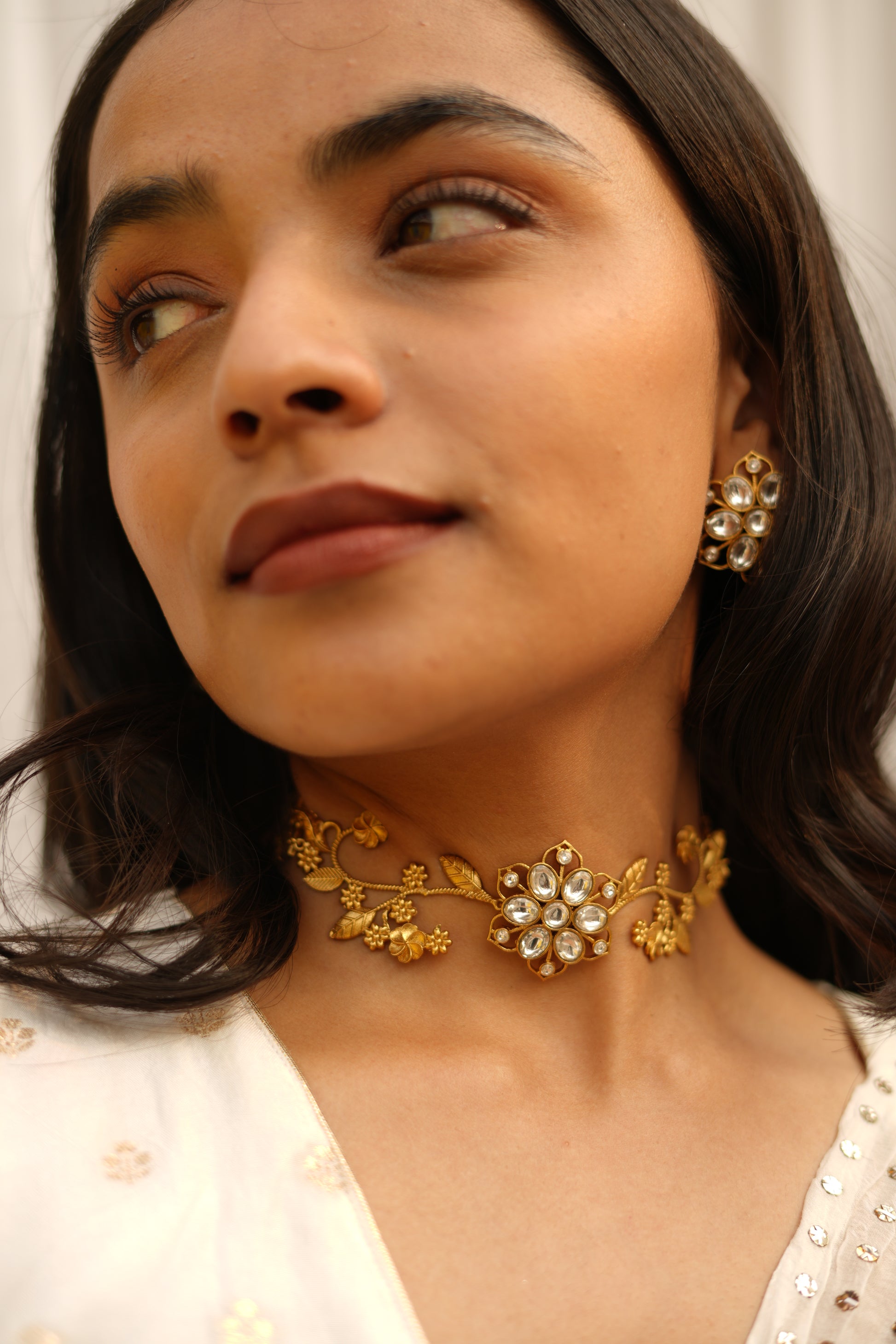Delicate yet richly detailed, this Aina choker is a poetic expression of the collection’s floral narrative. Crafted in a warm gold-finish base, the design traces the neckline like a gentle vine—adorned with sculpted leaves, tiny blossoms, and a central floral kundan motif. Hand-set white kundan stones form soft petals at the centre, catching light with a muted, graceful glow.