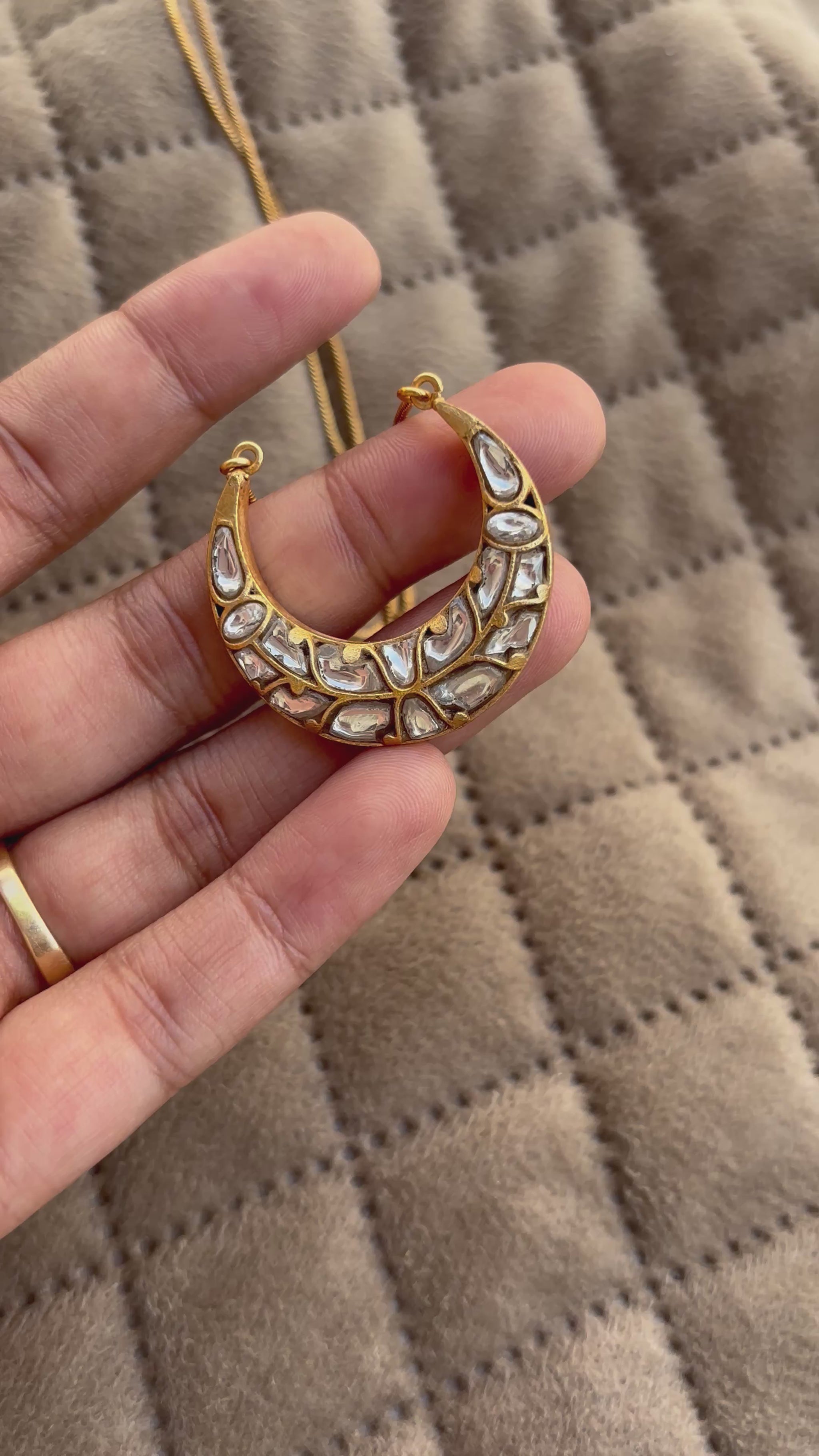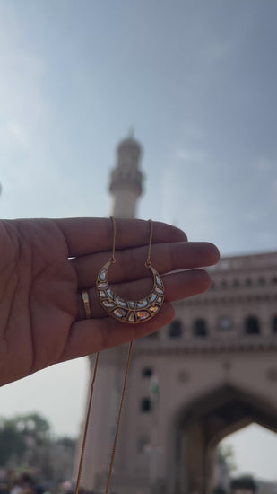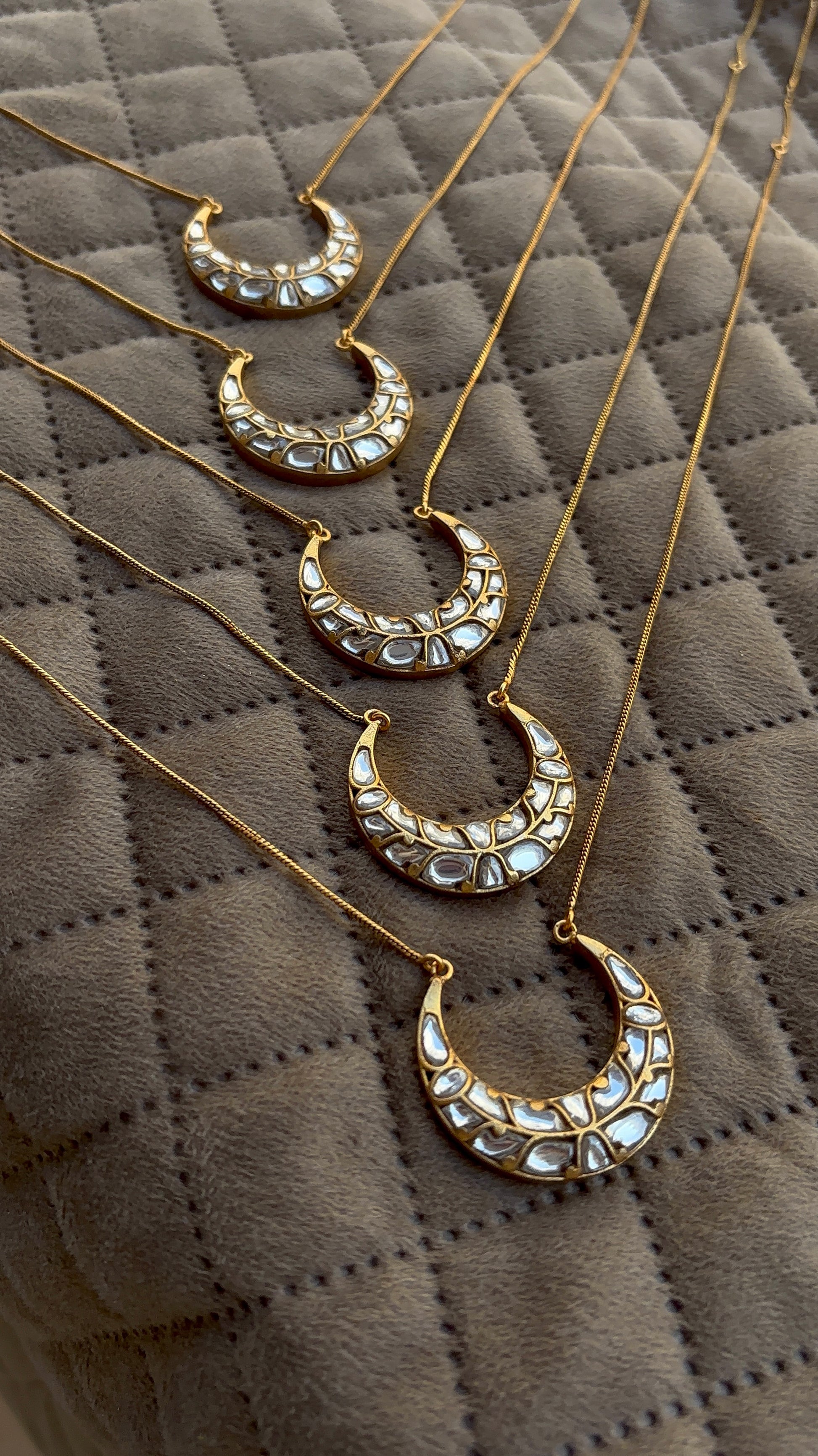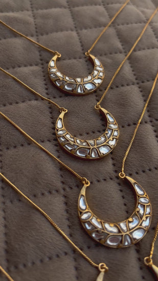 This handcrafted necklace features a half-moon pendant studded with delicate, white kundan stones—each one placed with the precision and poetry of true slowmade artistry.