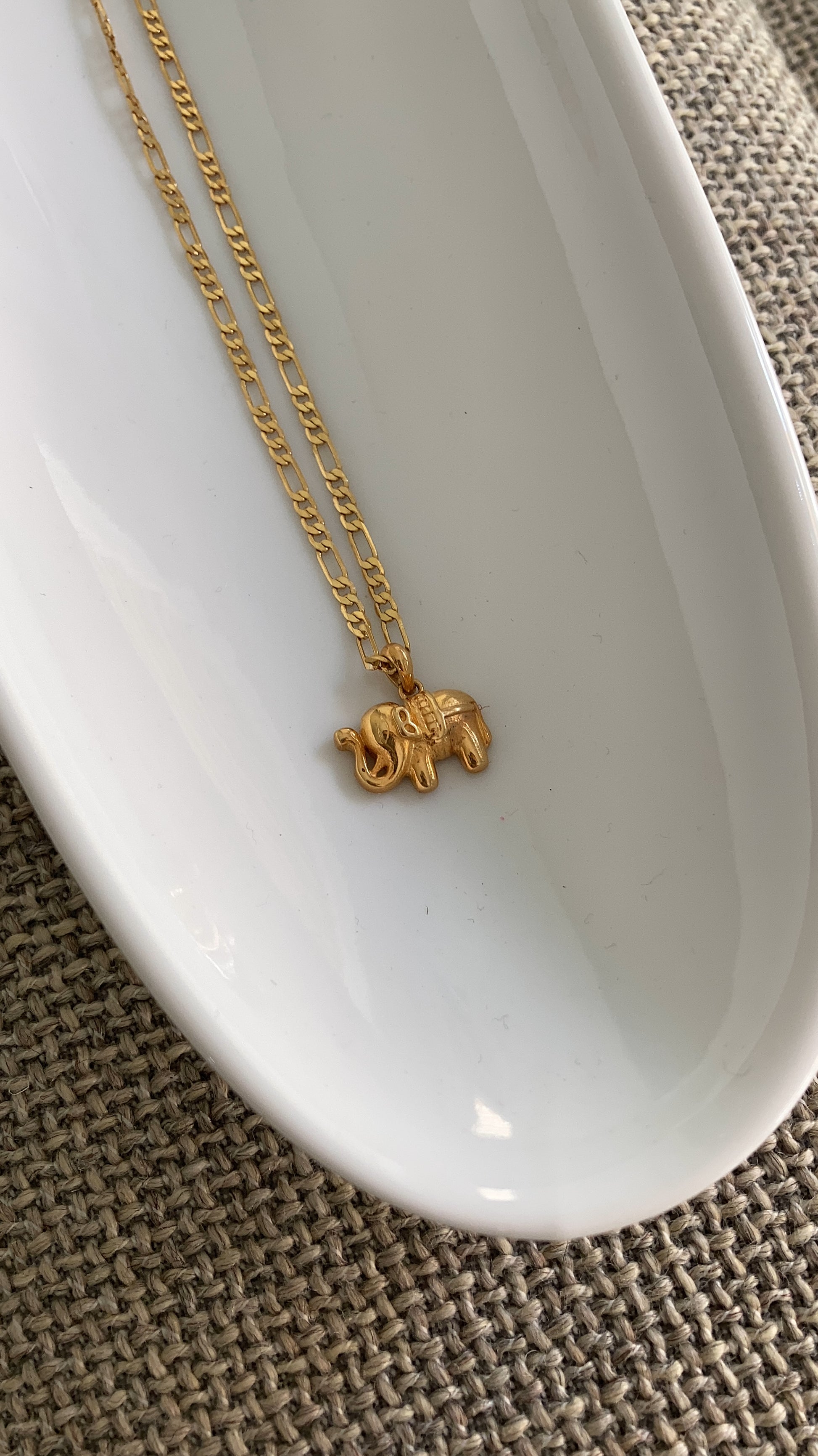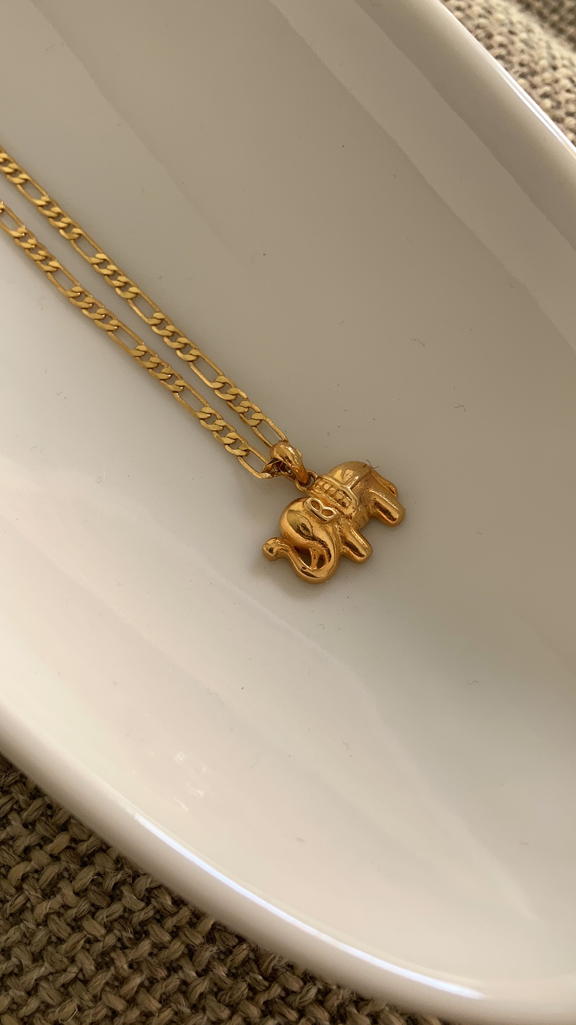 Our 22k matte gold plated pendant chain featuring an intricate motif: representing the white elephant who carries deity Indra! This is a staple piece in any wearer’s wardrobe!