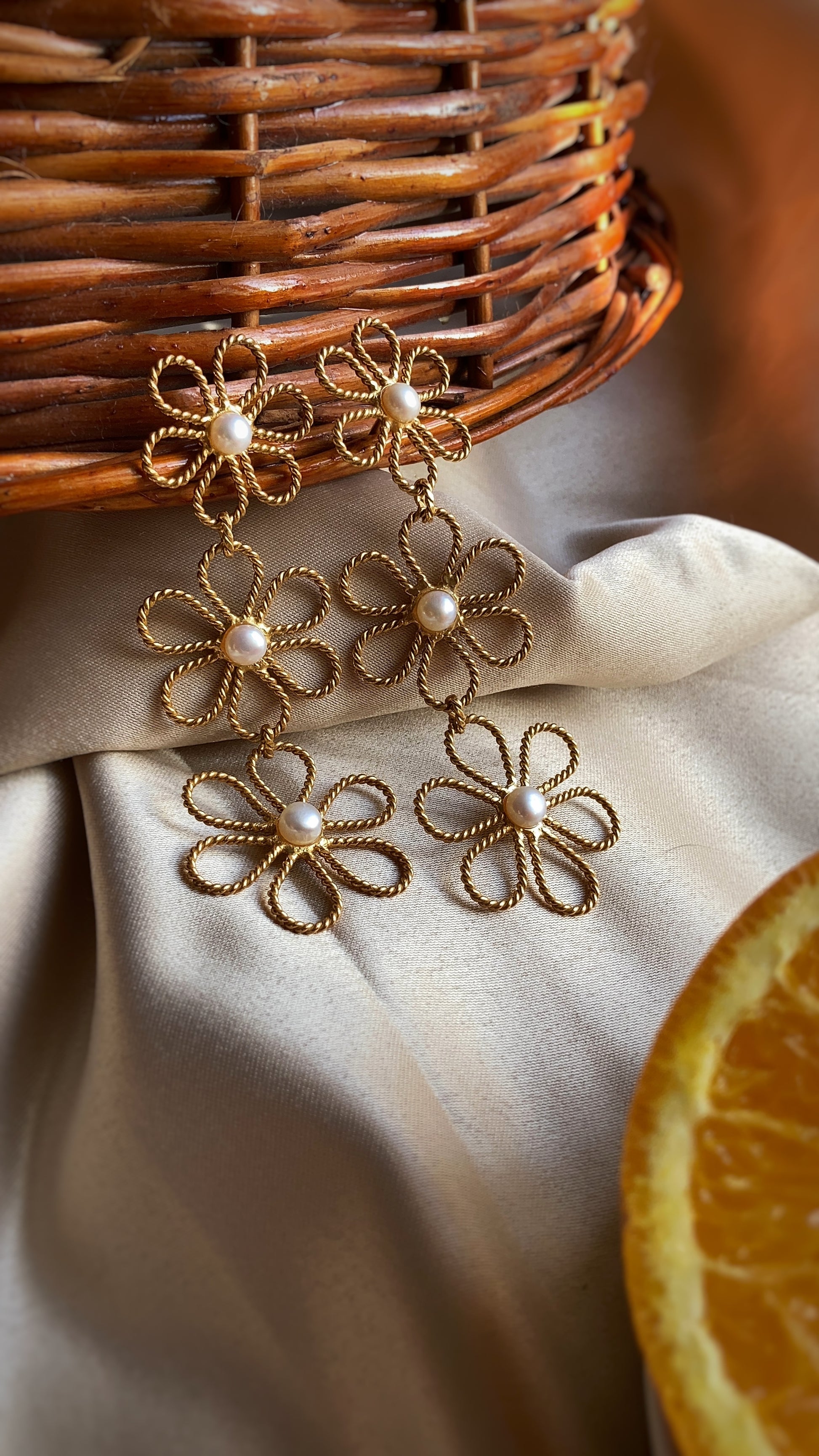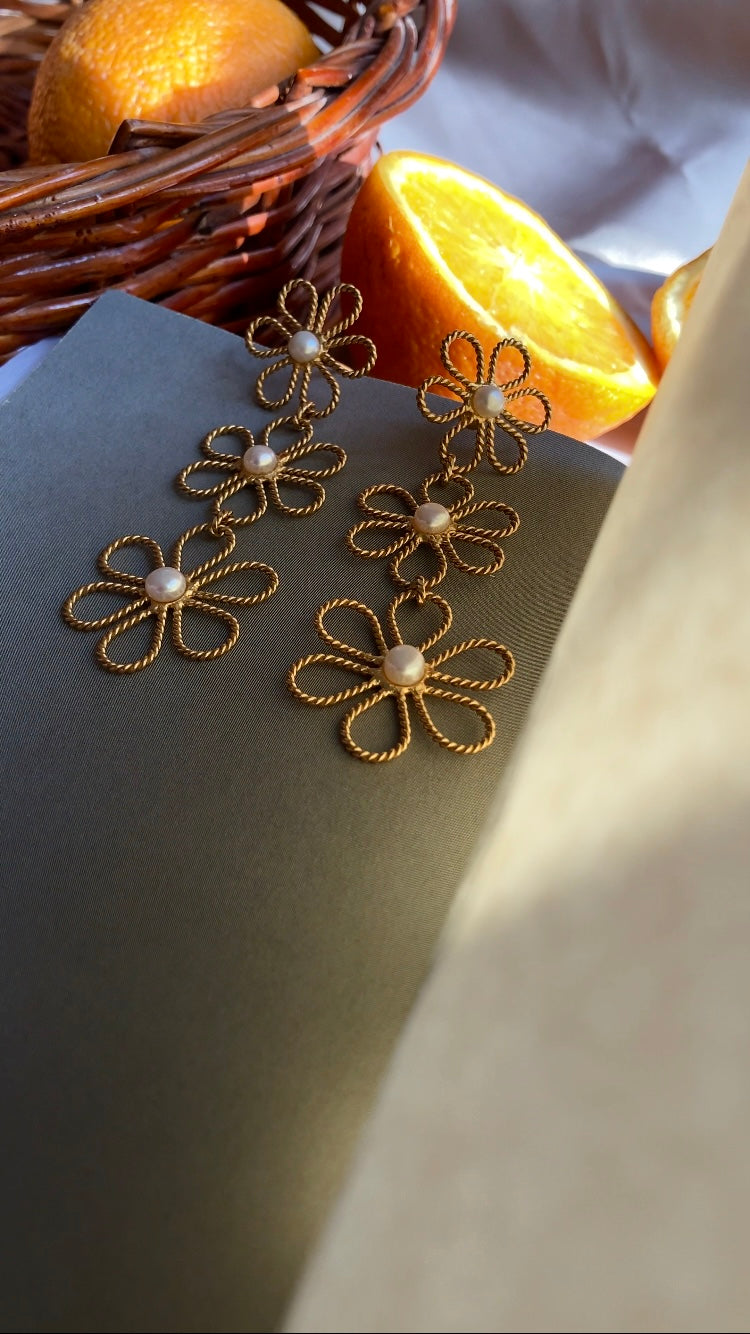 Made in 100% hypoallergenic brass and coated in 22k bright gold plating with a pearl studded in each of the 3 floral components.