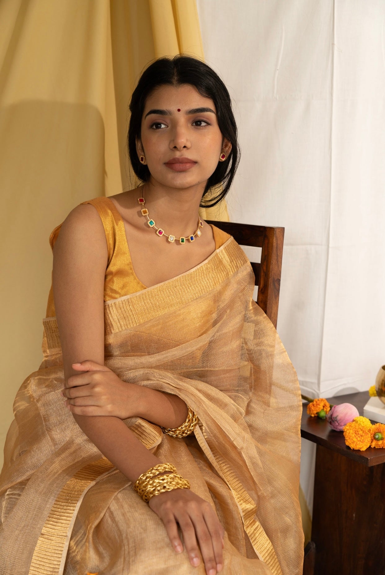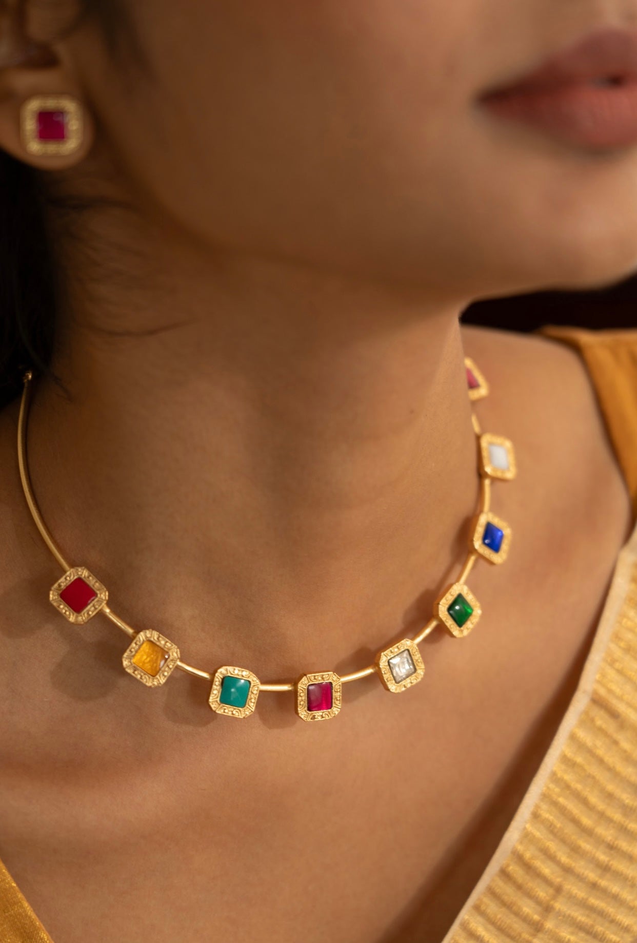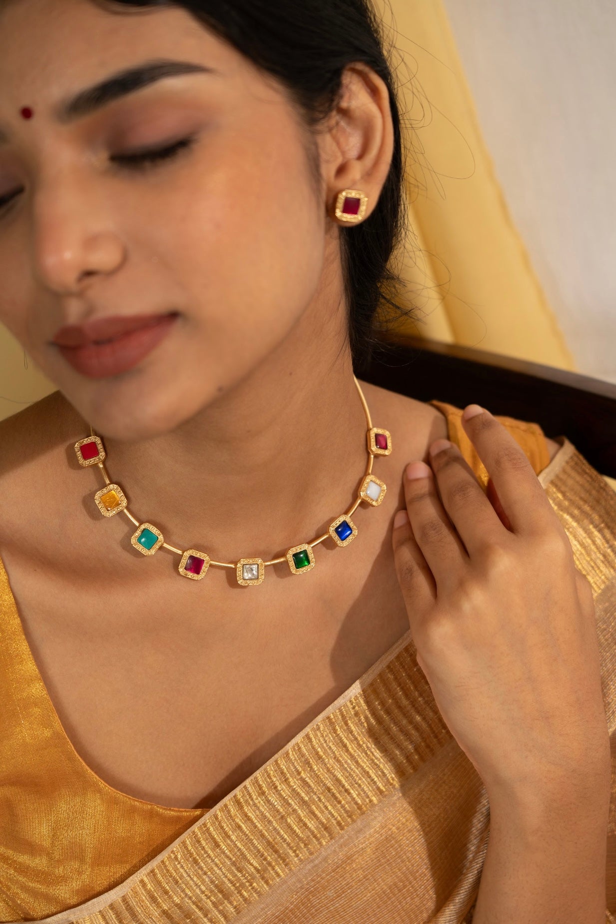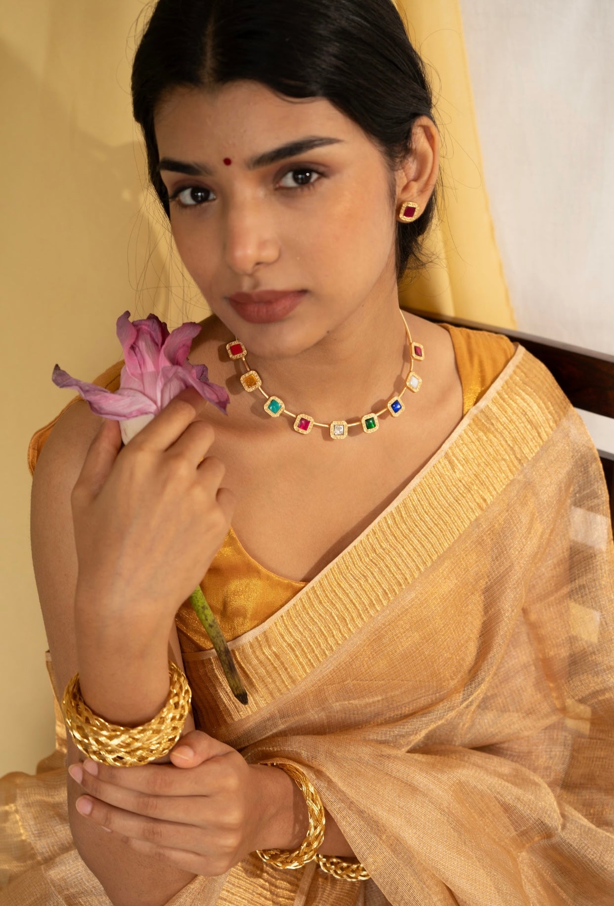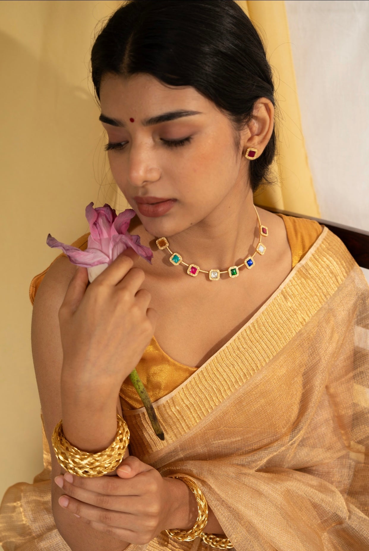The Anam Hasli : a true masterpiece of elegance, featuring a delicate array of navratan Kundan stones that radiate vibrant craftsmanship.