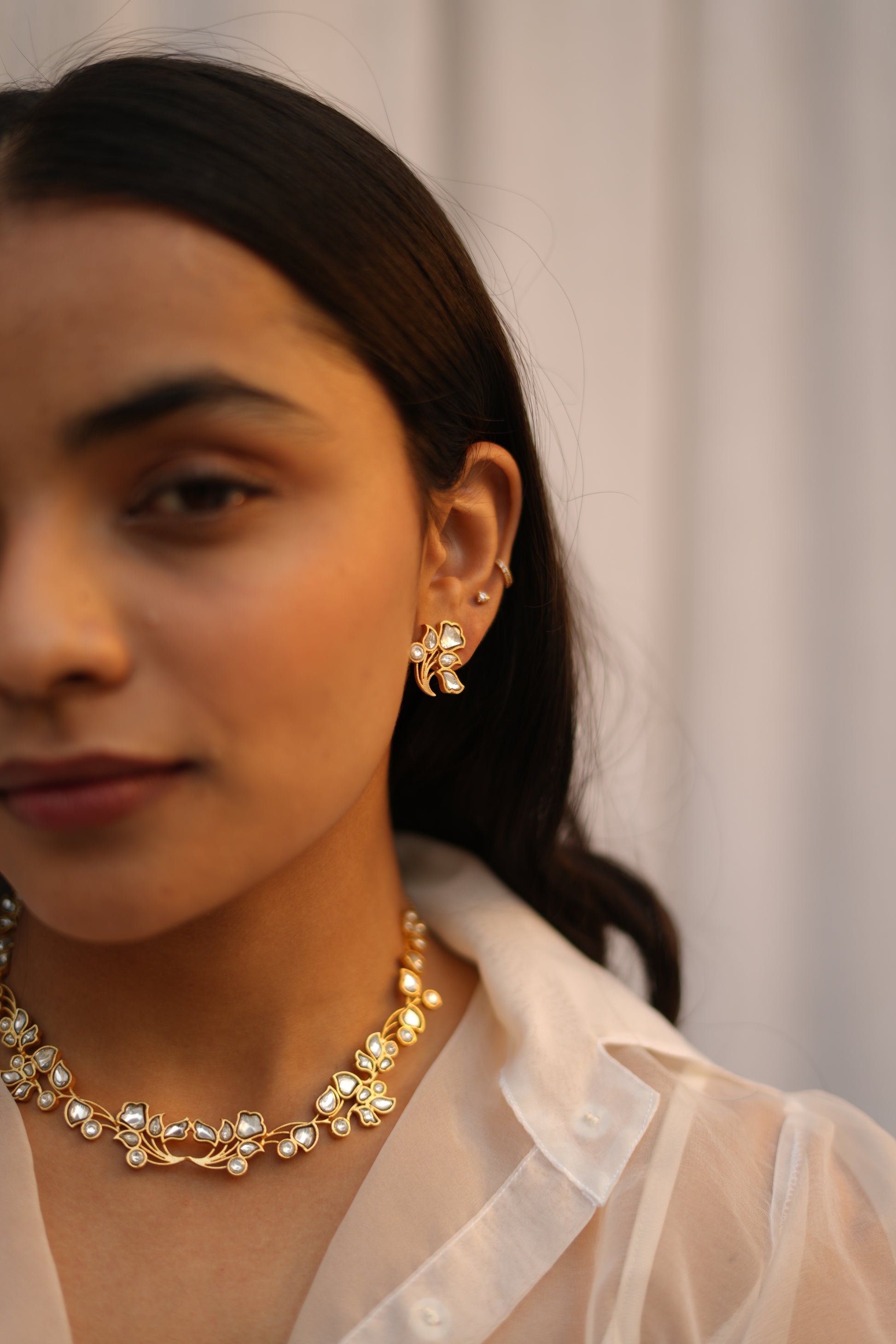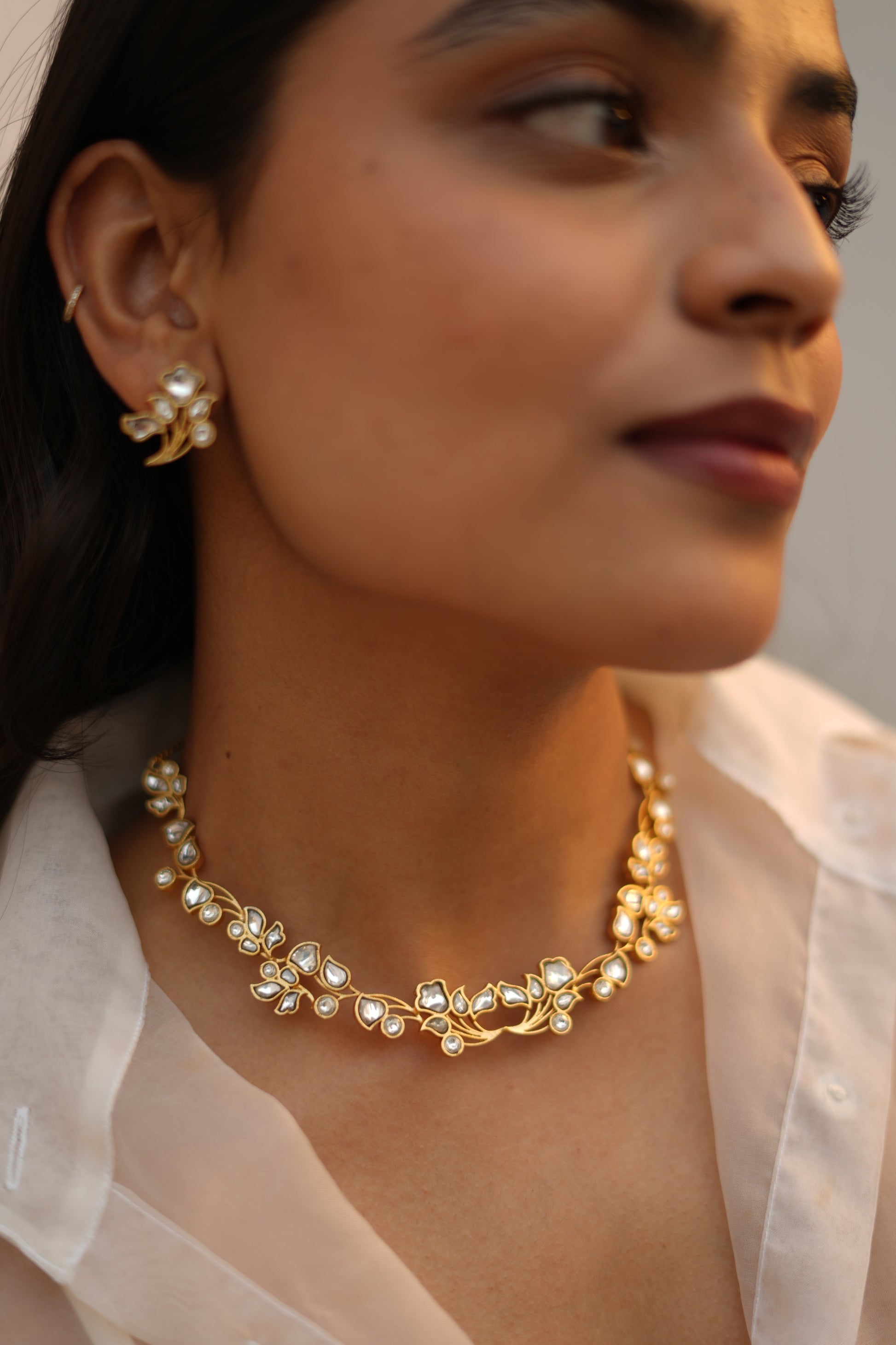 An ode to delicate craftsmanship, this Ira choker and studs set captures the essence of the collection’s refined elegance. The choker is crafted in a warm gold-finish base, designed as a fluid vine that gently embraces the neckline. Hand-set white kundan stones bloom along the form like soft petals, interspersed with subtle gold detailing that adds depth without excess. The silhouette feels light yet luxurious—structured enough to make a statement, soft enough to feel intimate.
