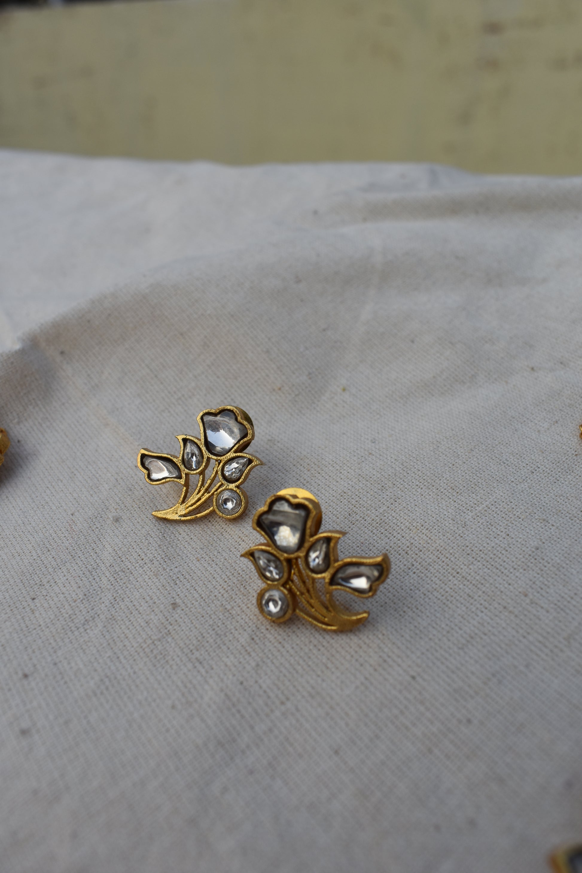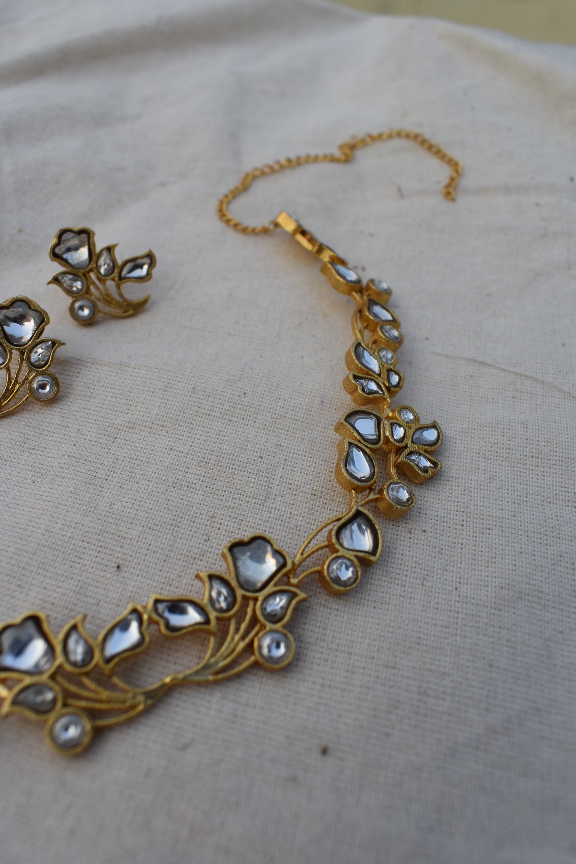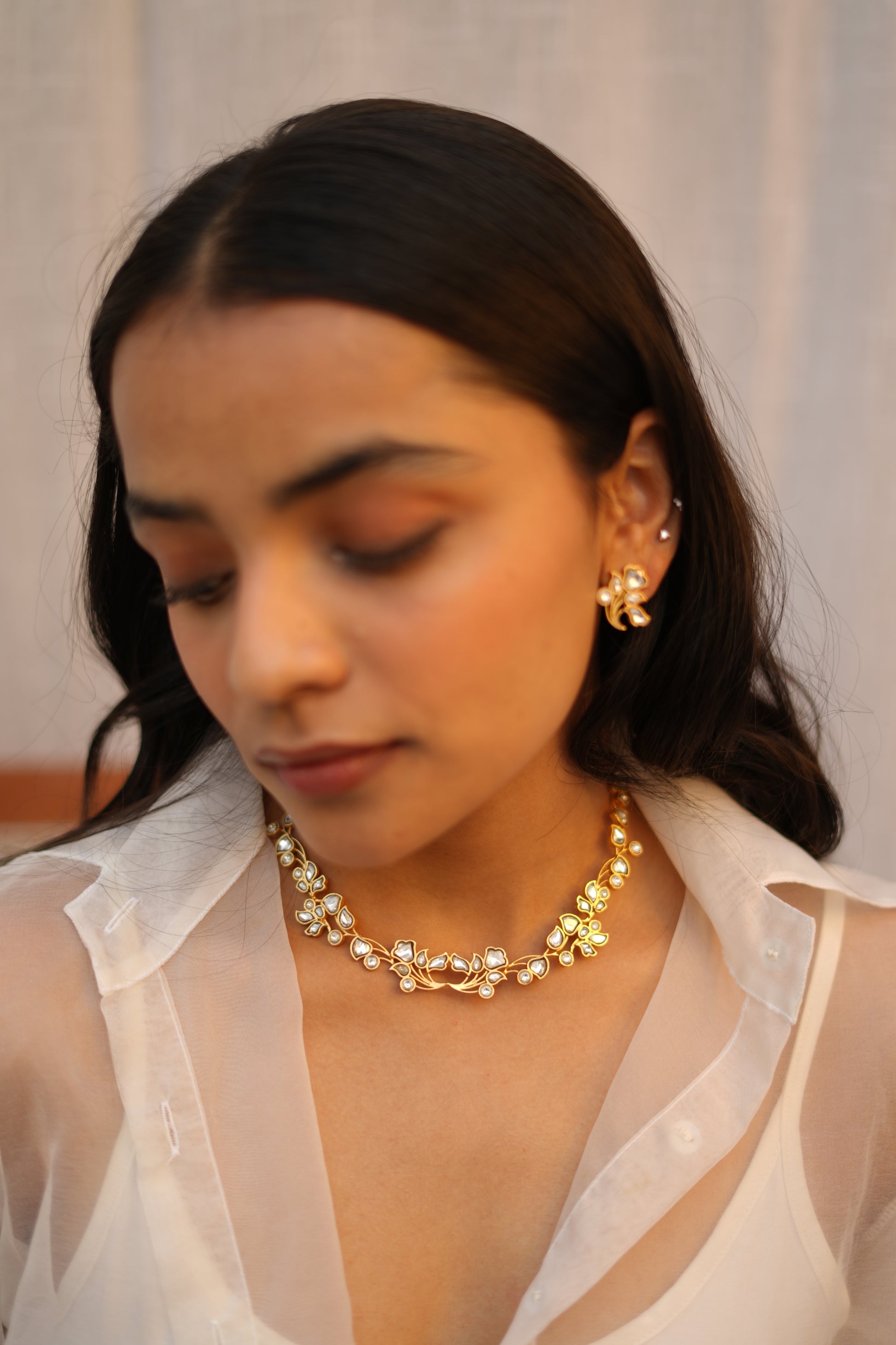 Paired with matching floral studs, the set feels harmonious and complete. The studs mirror the choker’s organic motifs, sitting close to the ear with a quiet shimmer that complements rather than competes. Together, they create a look that is timeless and serene—perfect for bridal moments, festive gatherings, or elevated everyday wear.