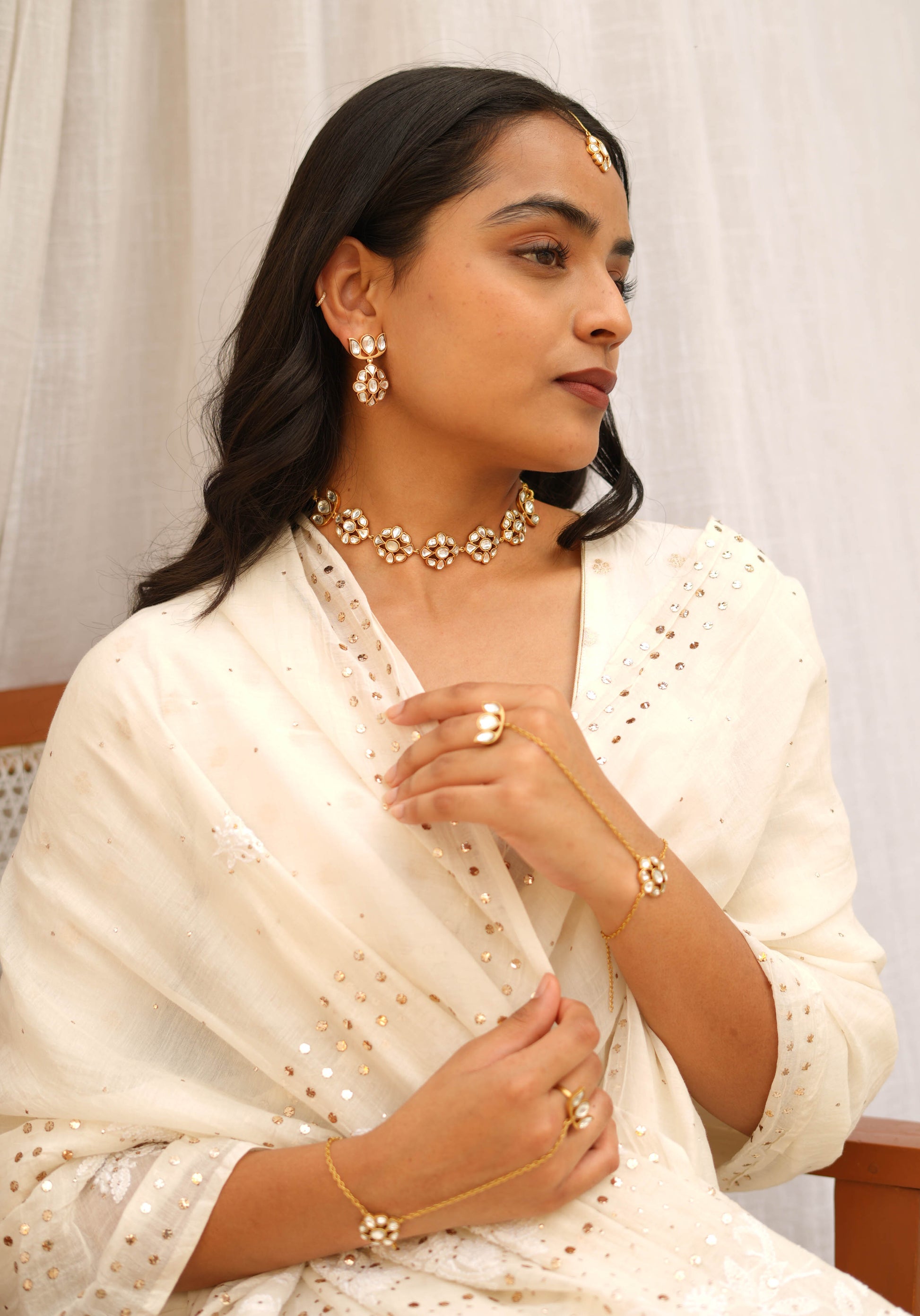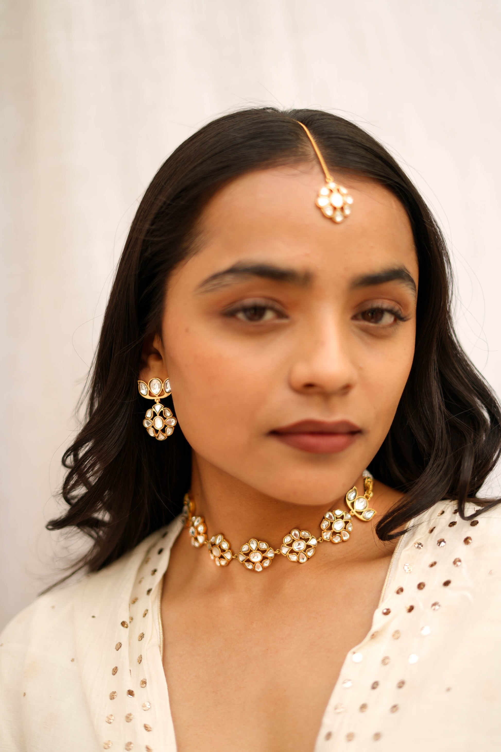 Designed to rest comfortably at the base of the neck, this choker brings a quiet glow to the skin—refined enough for intimate celebrations and elegant enough for bridal moments. Its understated symmetry allows it to pair effortlessly with matching studs and maangtikas, completing a look that is rooted in tradition yet effortlessly modern.