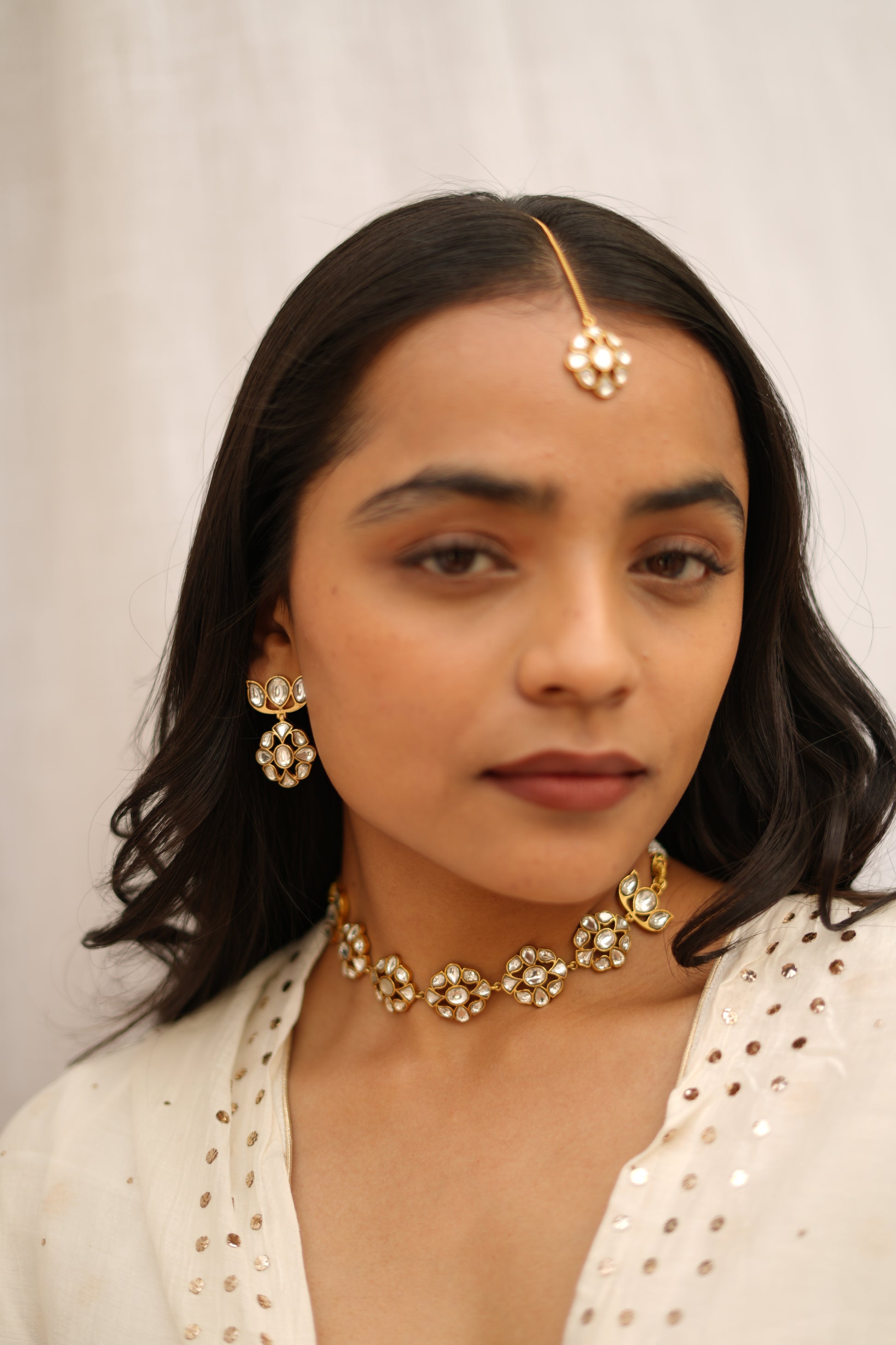 Each stone is hand-set to catch light delicately, creating a soft glow that feels refined rather than ornate. Versatile in scale and timeless in design, these studs pair beautifully with matching chokers or necklaces from the collection, while remaining distinctive enough to be worn on their own.