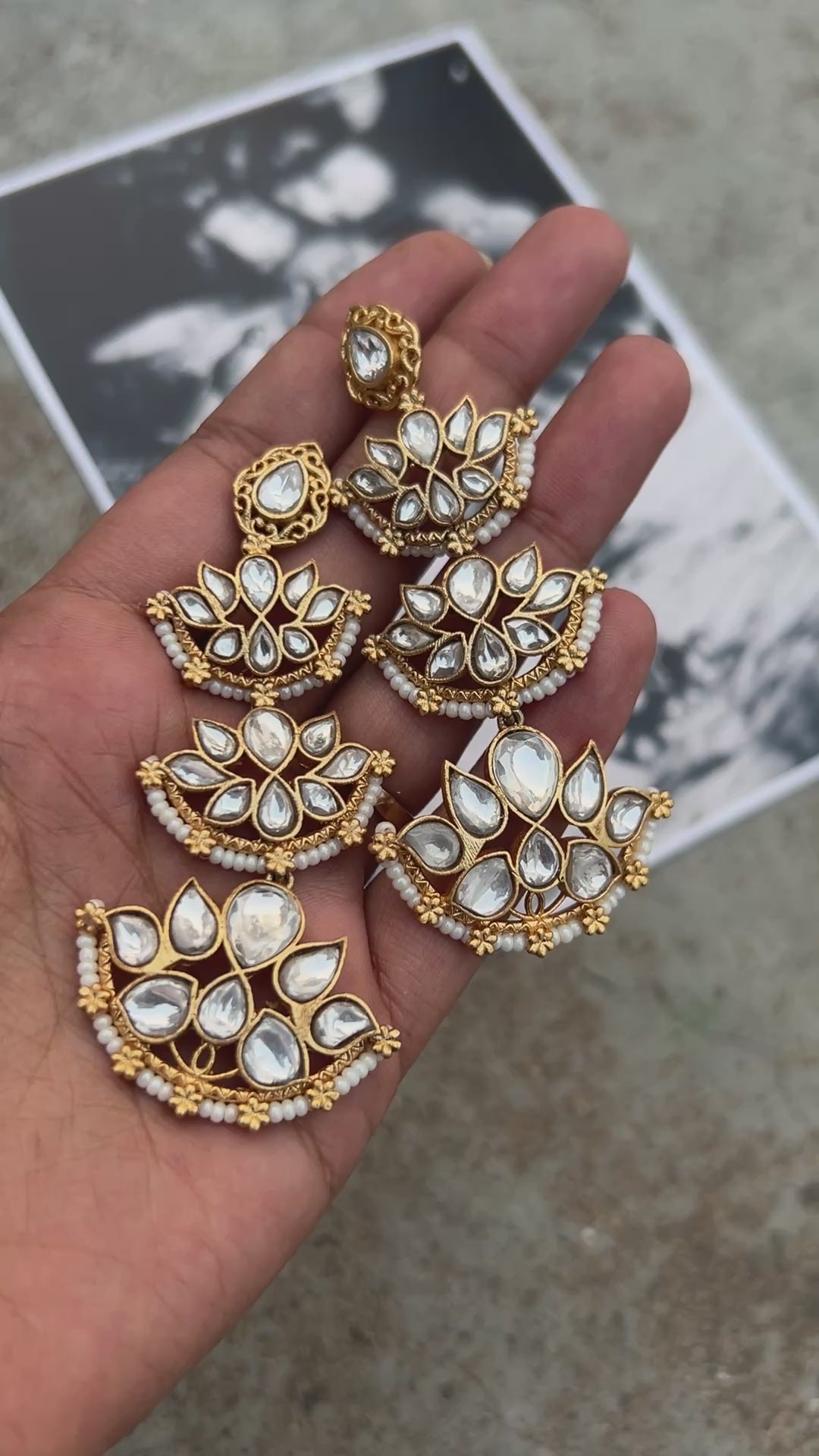 Graceful and expressive, these Roshni Danglers are a celebration of layered craftsmanship and timeless beauty. Crafted in a warm gold-finish base, the design unfolds in a cascading arrangement of floral kundan motifs, stacked delicately to create movement and rhythm. Each petal-shaped white kundan stone is hand-set, forming soft blooms that catch the light with a gentle, luminous glow.